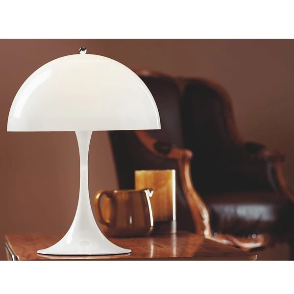 Louis Poulsen’s Panthella table lamp is one of the most popular products designed by Verner Panton. Panton’s aim was to create a lamp in which the base and the shade would both act as reflectors. The light source is hidden under the white, hemispheric acrylic shade and the trumpet-shaped base gives the lamp a distinctive, balanced silhouette and also contributes to the distribution of light. Originally released in 1971, Panthella is today considered a classic of Danish design and is available in a range of sizes and colours.
